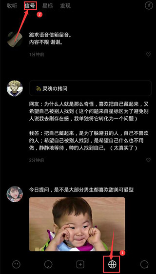 1、打开软件后点击星球标识,然后在点击信号,可以看到里面有很多篇内容,然后选择自己喜欢的一篇;