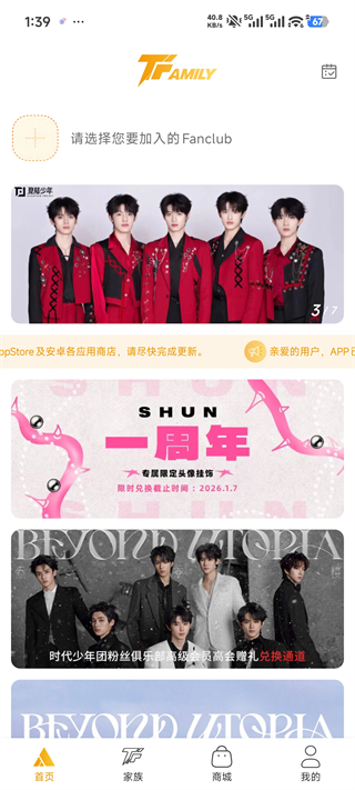 1、打开T-FAMILY APP,进入“家族”页面(或找到“请选择您要加入的Fanclub”入口);