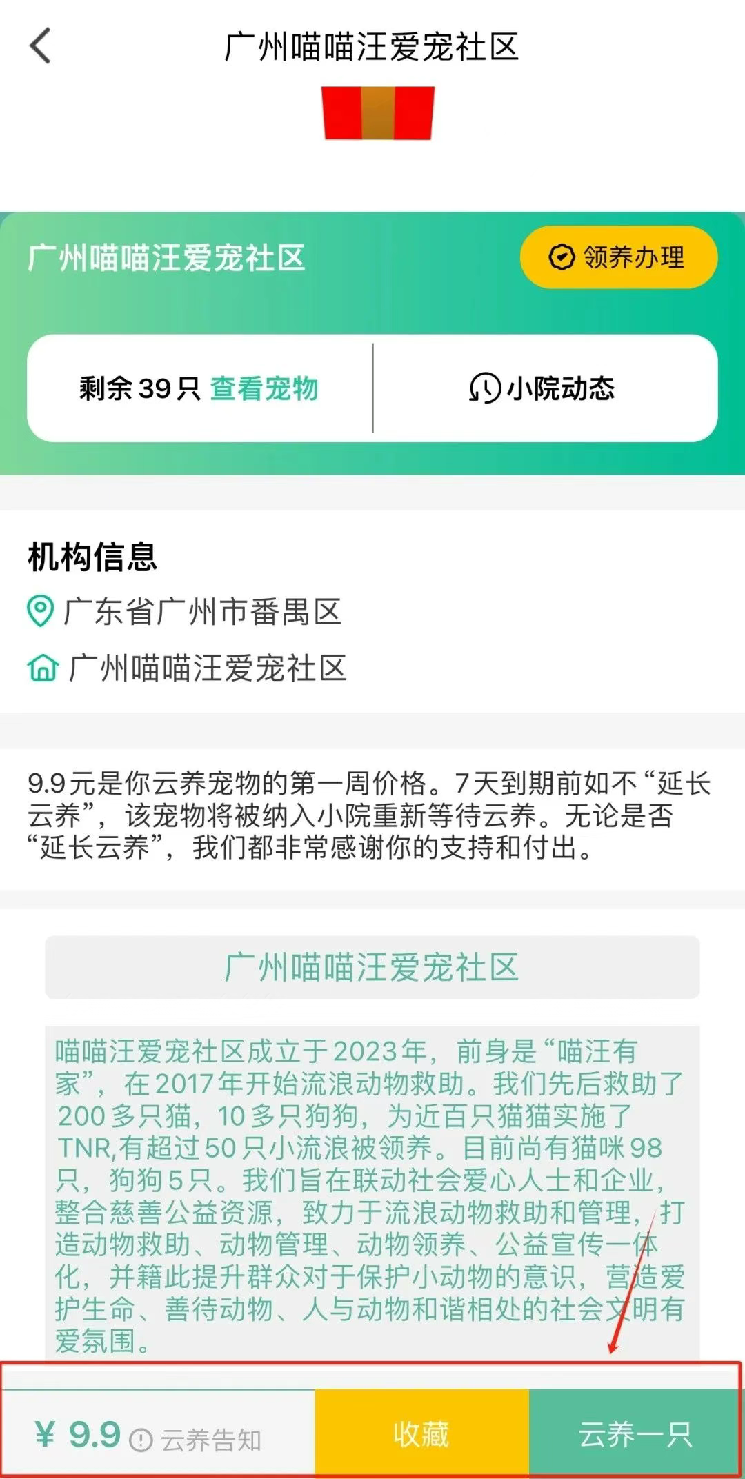 帮助爱心小院养流浪动物;云养后,你每周能看到牠的视频动态,并具有优先领养权。