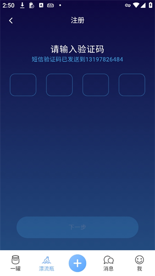 4、点击漂流瓶输入手机号注册