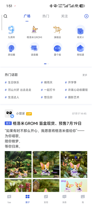 3、圈子广场设置多个频道,可发帖与许嵩及其他用户互动,还可以点击“关注”查看关注人的最新动态。