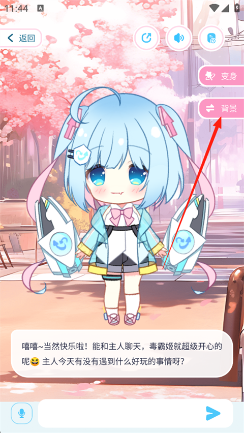 点击右上角“变身”键,可实时切换角色形象与背景,支持自定义尺寸和位置。