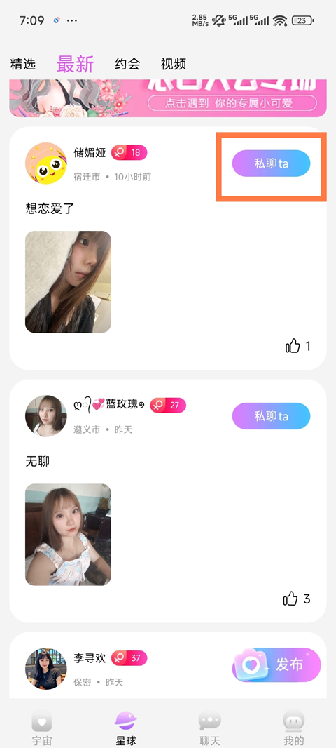 4、如果你不想打视频,可以点击星球板块,这里也有很多漂亮小姐姐,点击私聊ta