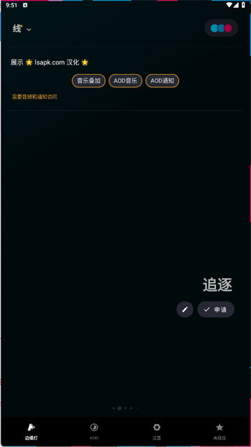 muvizedge中文汉化版是一款能够跟着音乐节奏变换出炫酷跑马灯的手机应用,使用它你可以更加沉浸式体验到音乐的节奏,屏幕边缘的浪漫灯光与音乐的节奏的相结合,让你获得极致陶醉的感受,非常有氛围感。用起来特别的简单,设置好以后在自己喜欢的音乐应用程序中收听音乐时,以在屏幕边缘显示实时音乐可视化工具以及跑马灯,充当你的音乐伴侣~享受听觉盛宴的同时感受到视觉冲击,手机屏幕周围的可视光圈给你带来前所未有的视觉聆听效果。同时,muvizedge还支持各种颜色和样式的自定义设置,感兴趣的朋友可以搭配自己喜欢的颜色,制作出更加炫酷的灯光,让你的手机更加炫酷。