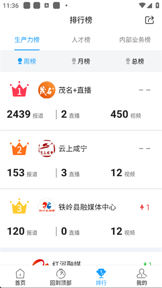 通过生产力榜、人才榜、内部业务榜展示入驻机构的报道、直播、视频产出数据,直观呈现各机构内容创作活力。
