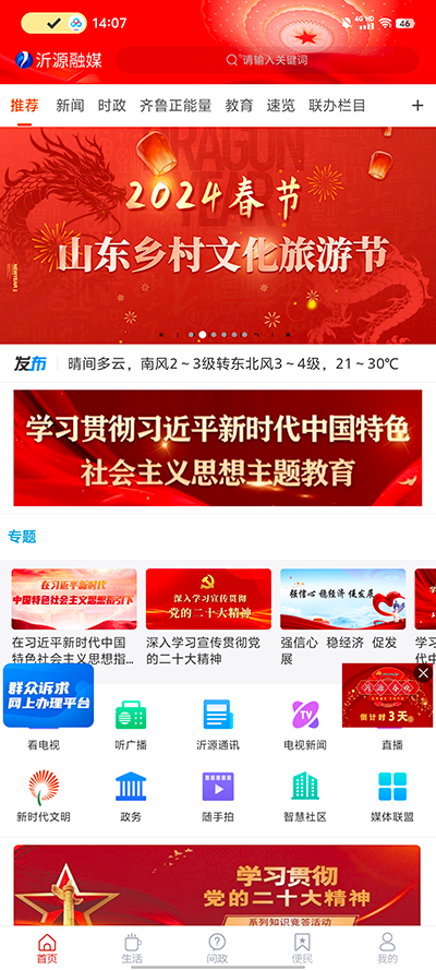 沂源融媒app是一款本地新闻资讯软件,整合了电视、广播、新媒体、报纸等,能够迅速传递权威新闻资讯,并支持多种在线政务服务及便民服务功能。现在用户下载即可享受到:广播电视台各频道,频率直播、点播节目;能随时游览每日新闻资讯、还能轻松了解天气、 公交、道路交通信息、旅游、空气质量等便民信息;还归纳了众多实用服务功能,涵盖群众生活的方方面面,用户可通过沂源融媒客户端,了解沂源政治、财经、民生等方面的新动态,实现“一端在手,掌握天下”。