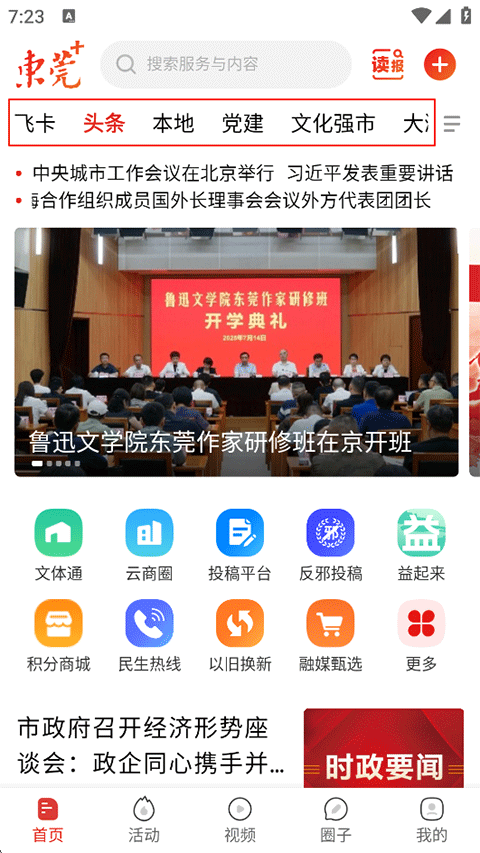 1、打开东莞+APP,在首页切换板块内容资讯或在搜索栏搜索您感兴趣的内容;