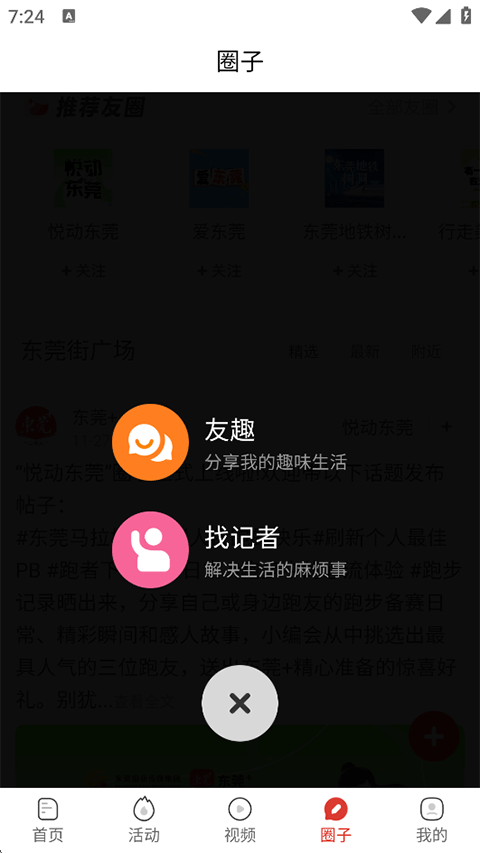 5、切换到圈子功能页后点击右侧的+图标可以分享您的趣味生活,或是找记者解决生活中的麻烦事儿;