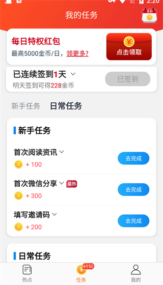 向下滑动此界面,可以看到新手任务和日常任务两个分类,新手任务就是指的您在刚刚接触淘最热点时需要做的任务,日常任务就是指的您每天做这些任务就可以获得金币。