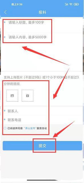 进入报料界面,输入标题、内容描述、上传图片或视频、联系人、联系电话、勾选已阅读并同意“萧山发布”服务协议,点击【提交】。