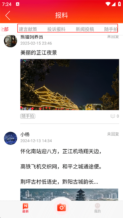 1、打开掌上怀化APP,点击我的-我的爆料;