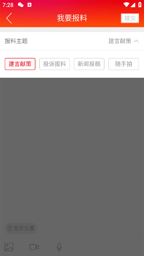 4、输入你想要报料投稿的内容,下方还支持上传图片、视频和声音,完成后点击提交即可。