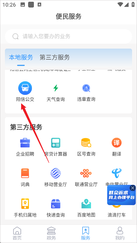 2、在服务页面选择阳信公交