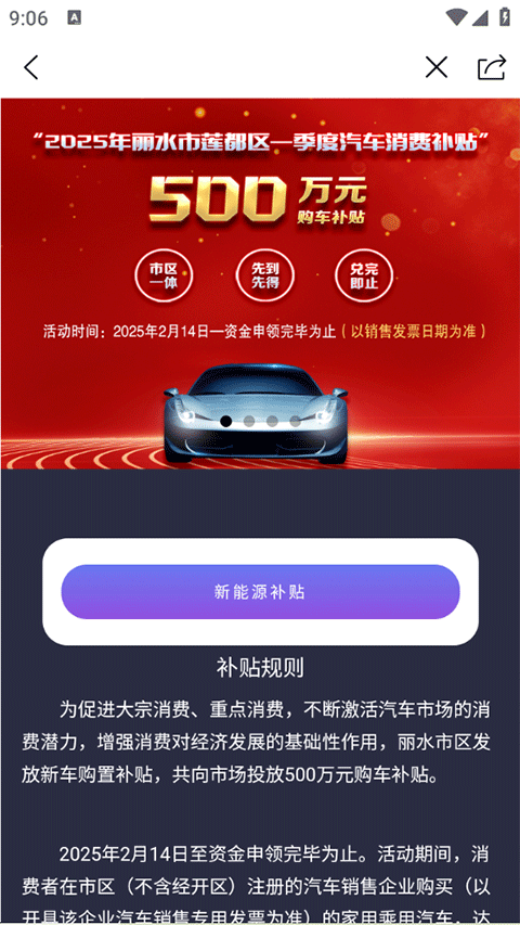 5、阅读下方的补贴规则,了解细则后点击新能源补贴,输入手机号和验证码进入填表;
