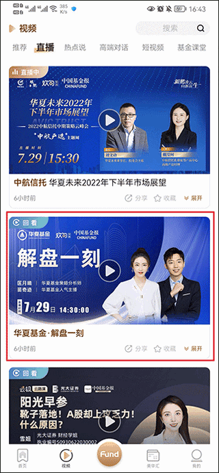 1、打开中国基金报手机版app,在视频界面中点击直播,进入后在直播视频的左上角可以看到直播或回放,选择你要观看的直播回放;