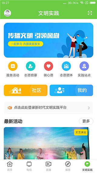 6、在文明实践中有着服务活动、志愿招募、微心愿、志愿团体、实践站点、社区、我的、最新活动等功能: