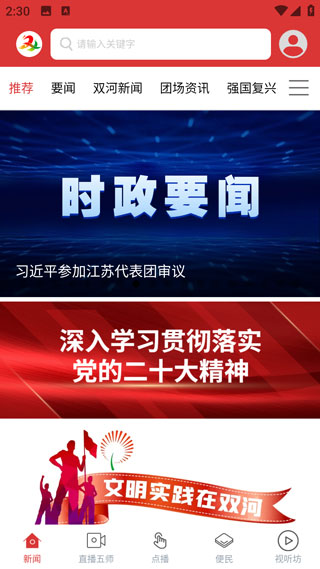 云上双河app是一款为新疆双河居民量身打造的一个便捷生活资讯服务平台,由新疆生产建设兵团第五师融媒体中心倾心打造,是一款新颖的融媒体综合服务类型手机应用,会实时更新最新的政务新闻,让人们及时了解最新的新闻资讯,可以及时的查看到最新最热门的网络动态,还有许多的精彩直播内容和动态视频,同时也是党的重要宣扬阵地,是五师权威发布、政务服务的重要入口,不仅架起了群众与政府沟通的桥梁,让民众可以走近政府,更让大家能够时刻了解众多政务,阅读最新的新闻,并且与兵团14个师市融媒体中心互联互通,是五师党委新闻舆论工作的重要阵地,是五师党委和政府的重要执政资源,是引导群众、服务群众的重要平台,有需要的用户可以下载一个体验。