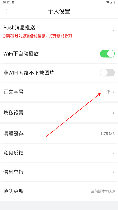 3、接着在【设置】界面内点击【正文字号】;