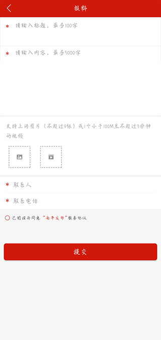 3、进入报料窗口,输入报料标题、报料内容、上传图片或视频、联系人、联系电话,最后点击提交即可。