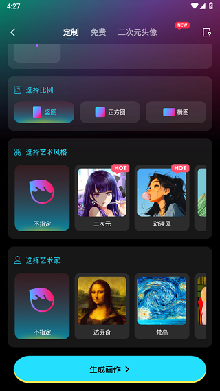 1、高品质的AI创作服务,让用户在没有绘画基础的情况下也能掌握不同的高品质作品,在合理的创作中生成多种多样的画作;