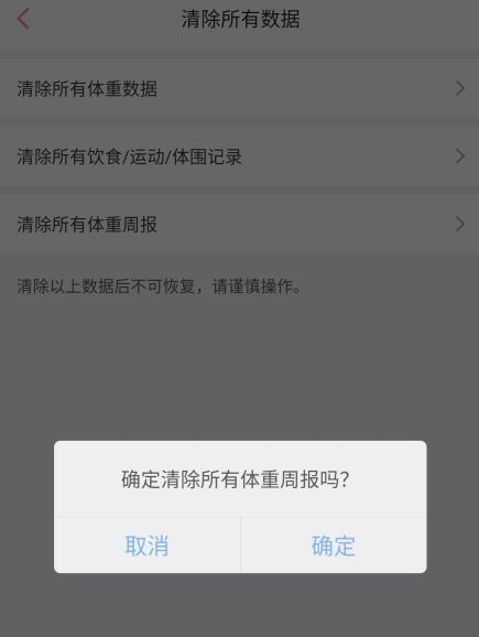 3、在这里可以清除所有体重数据、所有饮食/运动、体围记录和清除所有体重周报。