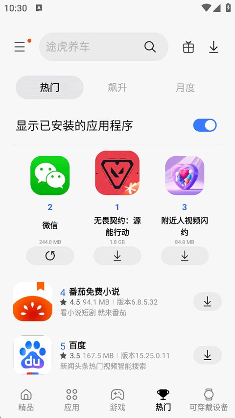 4、热门:飙升榜、月度榜,各大新品火热应用游戏即刻知晓;