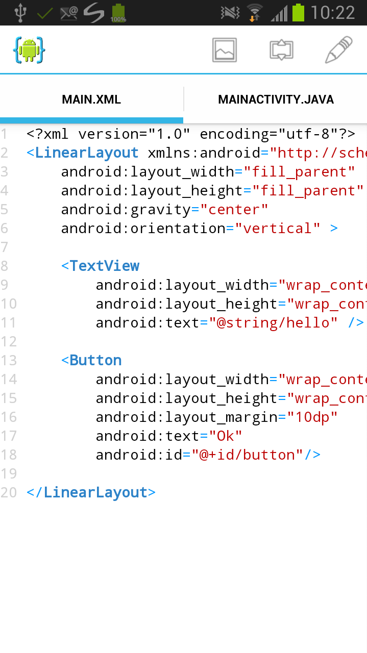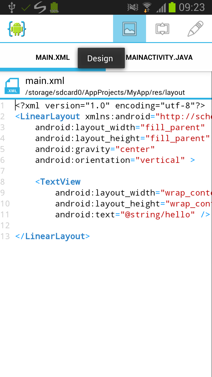 Android 应用程序的图形用户界面是使用 View 层次结构构建的。Android SDK 提供了一种 XML 文件格式,允许您使用 XML 中的 UI 元素的层次结构。当您创建“Hello World 应用程序”时,AIDE 会自动打开 main.xml 文件,用于定义此应用的主 Activity 界面。AIDE 有一个内置的设计器,可以向您展示这个 XML 定义的布局在运行时会是什么样子。