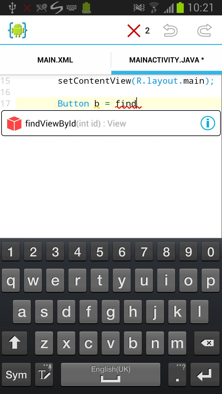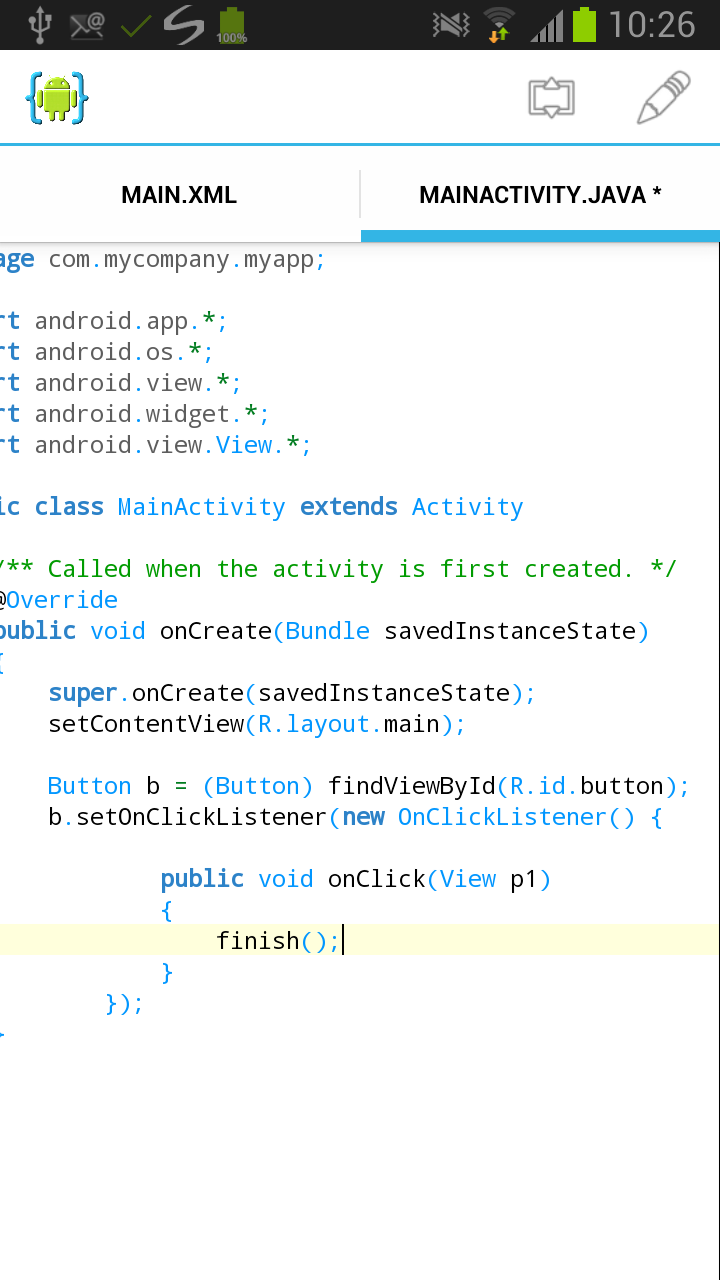 我们希望在用户点击按钮时退出应用程序。为此,您必须添加 代码来响应按钮的 on-click 事件。在 AIDE 中,切换到文件 MainActivity.java。在 onCreate 方法中,添加用于侦听按钮的 onclick 事件的 Java 代码。触发事件时,调用 “finish” 方法,该方法将完成 Activity,即退出应用程序。同样,AIDE 将通过显示完成建议来帮助您输入代码。