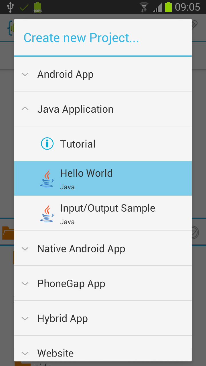 当您第一次在专家模式下启动 AIDE 时,您将看到“创建新项目”对话框。如果您已经打开了一个项目,则不会显示对话框,但您可以调用它从 AIDE 的集成文件浏览器中选择“在此处创建新项目...”。在 create app 对话框中,首先选择要创建的项目类型。对于您的第一个 Java 应用程序,请在此处选择“Java Console App / Hello World”。