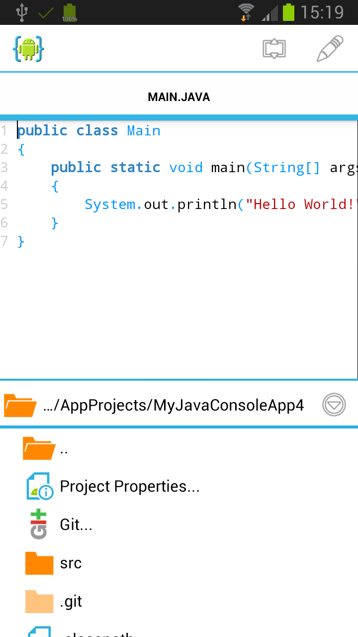 应用程序项目包含构成其源代码的所有文件。AIDE 将在您的 SD 卡上生成这些文件。AIDE 也会打开 main 类: Main.java。默认情况下,AIDE 将为您的新项目创建一个 Git 存储库。可以在设置中关闭此行为。
