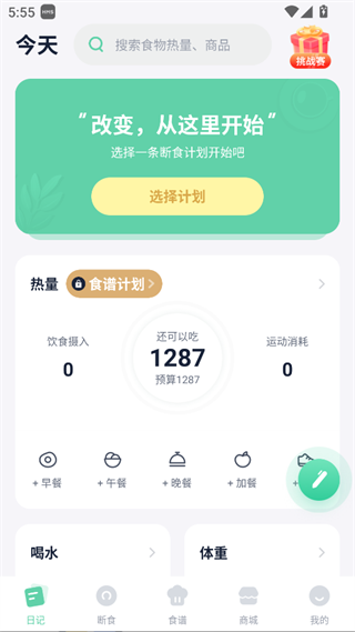 可记录饮食摄入、运动消耗、喝水量与体重,规划每日热量预算
