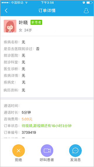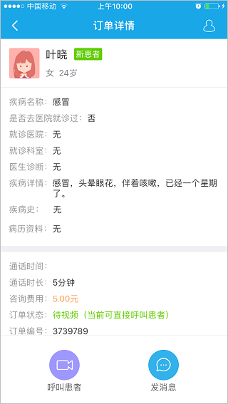 2、患者成功购买视频咨询后,系统会在约定的时间向您发起视频。系统最多发起三次,若三次您都没接,可以在24小时内在订单详情向患者发起通话,否则费用退回患者。