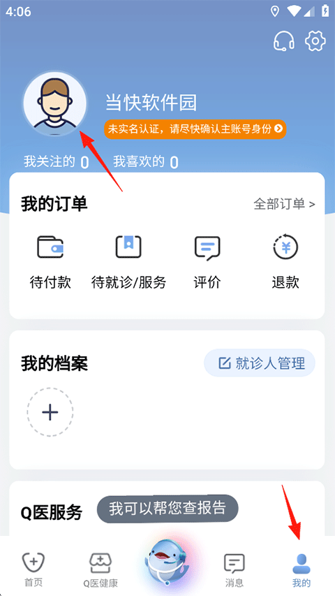 1、打开科瑞泰Q医APP,点击我的-个人头像;