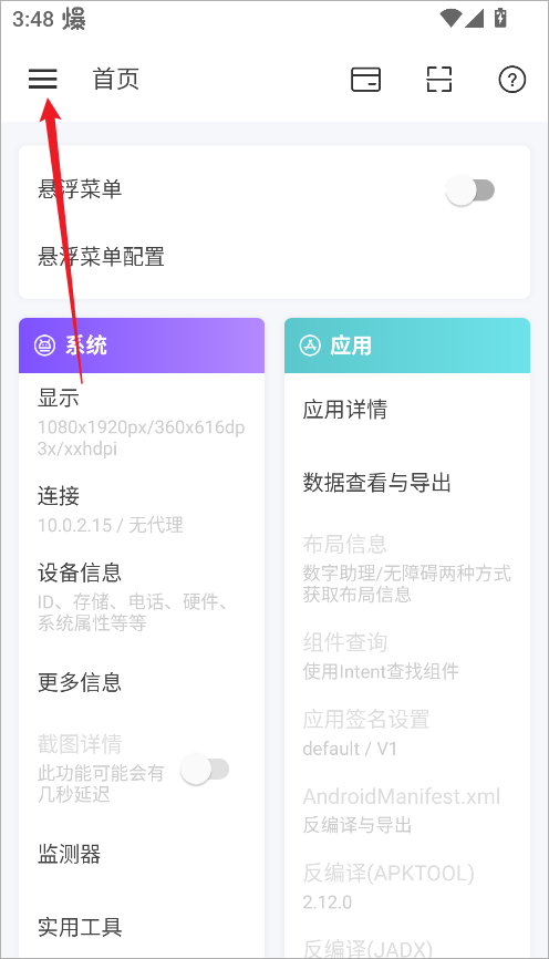 1、打开android开发工具箱后,先点击左上角的“三”形菜单,即可展开软件的详细功能区。