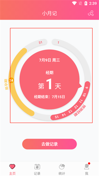 2、主面板综合月经周期的各种提示,简单清除、一目了然