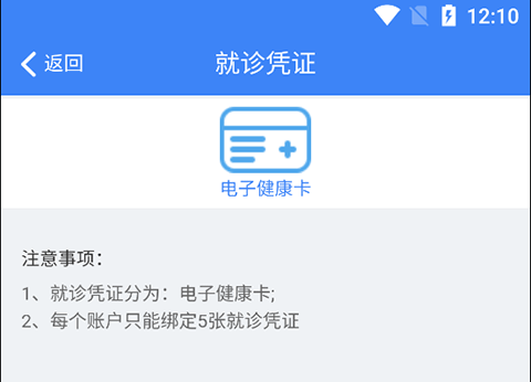 2、进入就诊凭证页面,就诊凭证分为电子健康卡,如果您有健康卡此处就会展示,注意每个账户只能绑定5张就诊凭证。