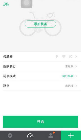 2、选择添加装备,传感器、组队骑行、码表模式、路熟后点击开始。