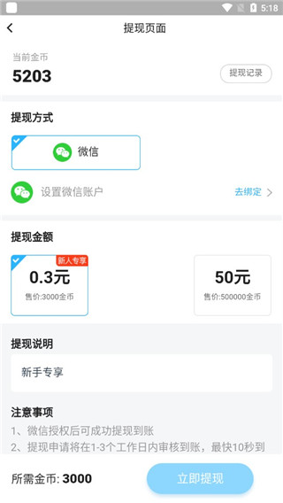 3、在“我的”中可以进行金币提现,提现后会直接到微信账户。