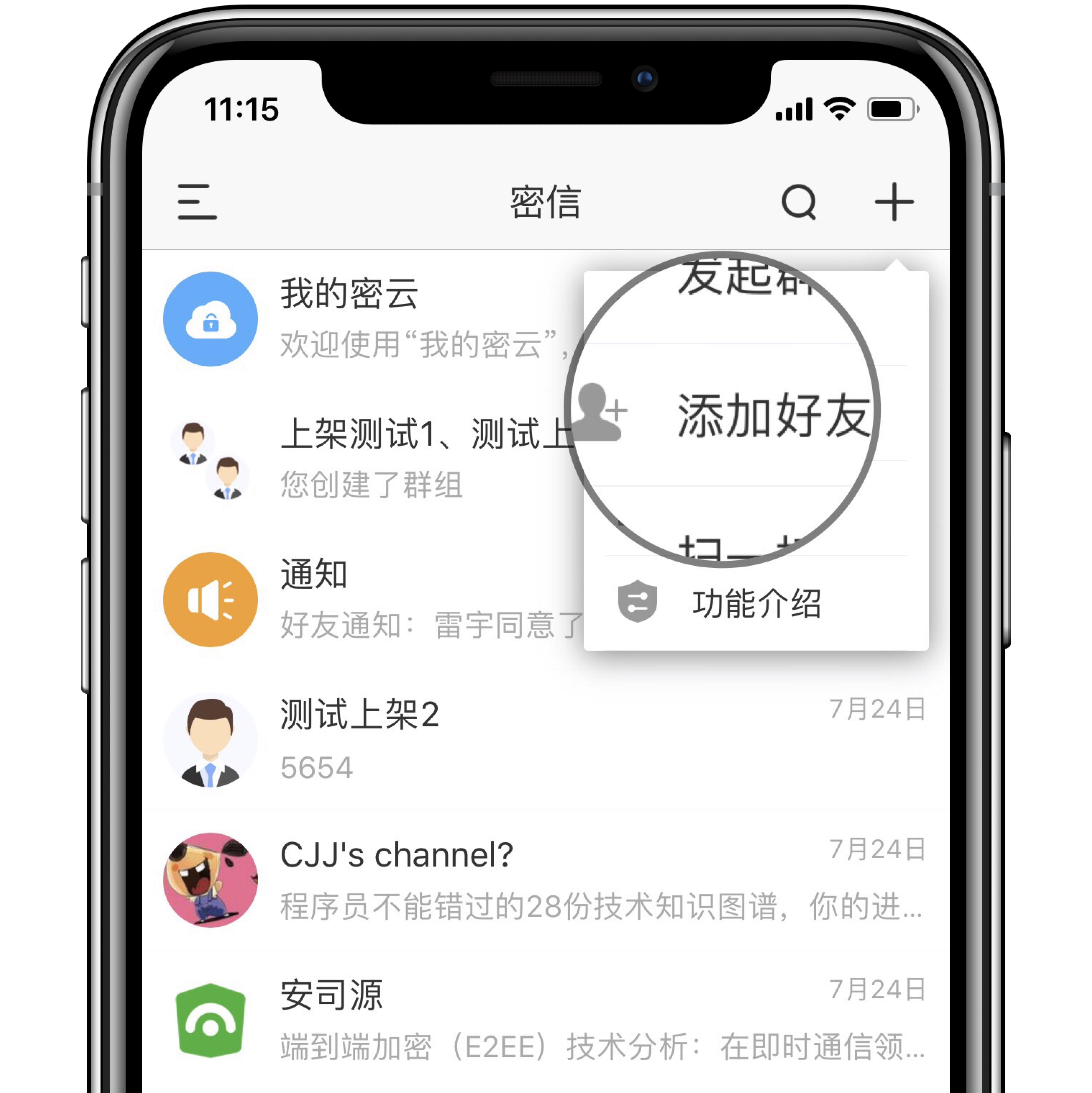APP主界面点击右上角'+',选择添加好友(搜索手机号/密信号/昵称),输入搜索内容后再点击在服务器上继续搜索;或右上角'+'中选择扫一扫,扫描对方的二维码