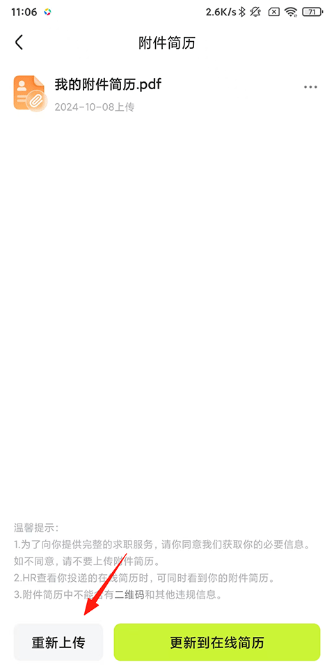 2、进入后点击下方的上传简历附件;