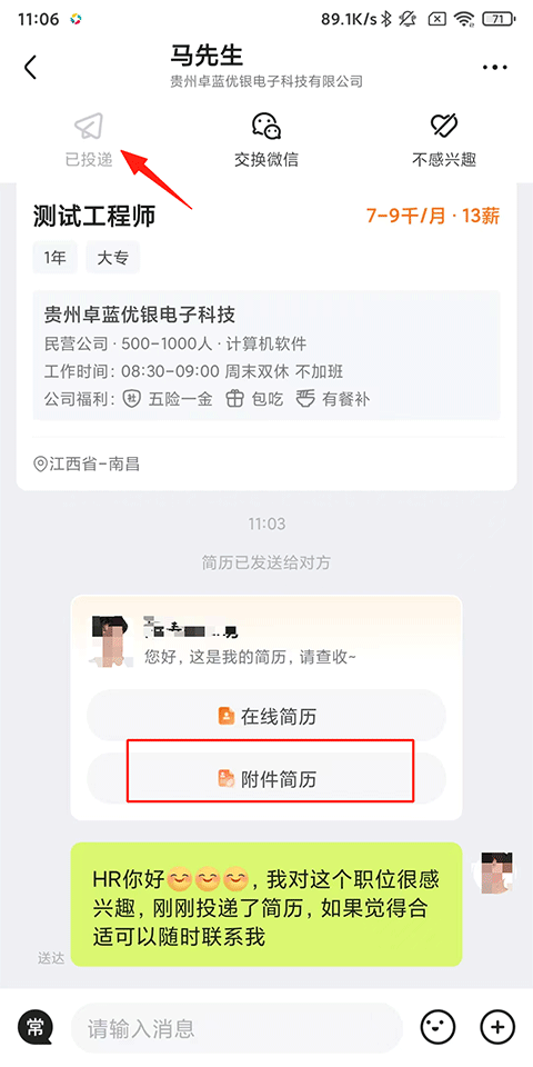 4、上传后进入与HR沟通页面,点击上方的投递即可发送简历附件。