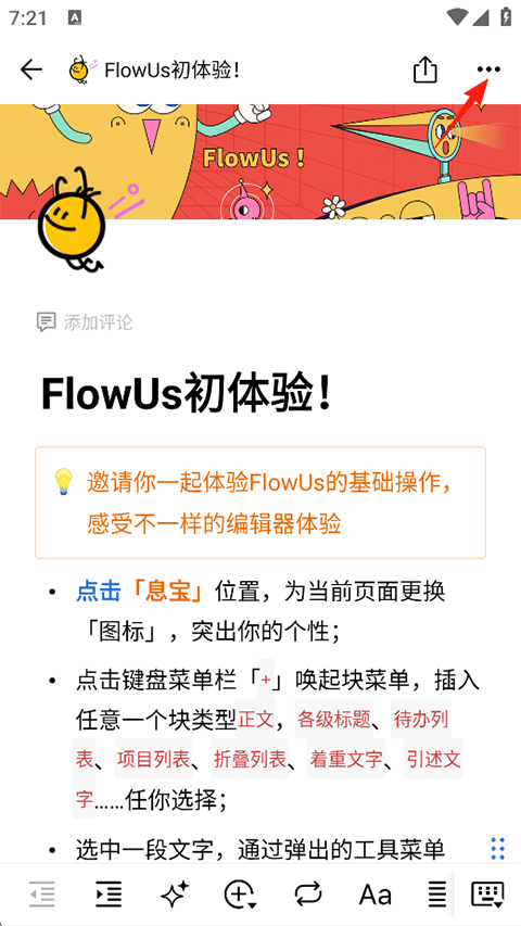 1、打开FlowUs息流,选择一个需要导出的页面文档并点击右上角的...扩展按钮;