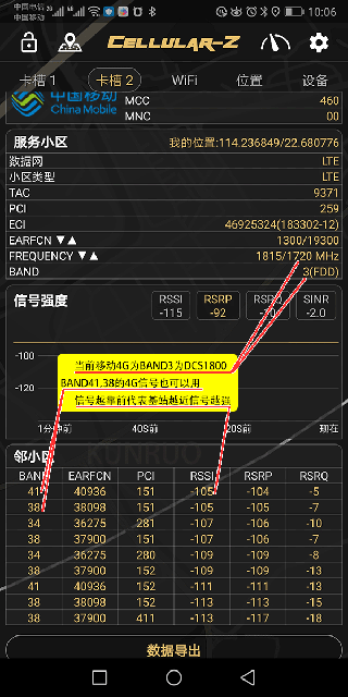 移动关闭了4G功率,所以测试出来的手机信号是2G的信号。