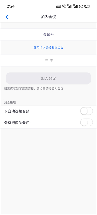 【加入会议】支持输入会议号/个人链接名加会,可提前设置【不自动连音频、关摄像头】。