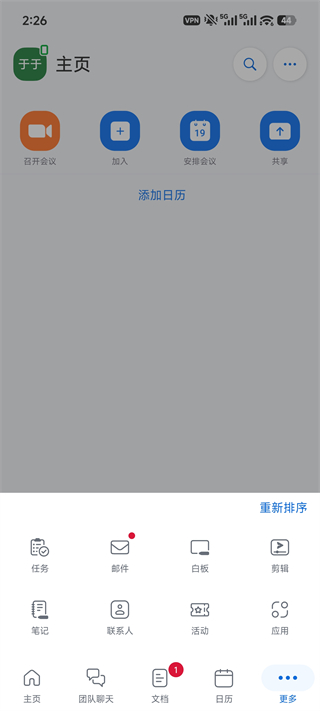 【更多】界面展示【任务、邮件、白板】等拓展功能。