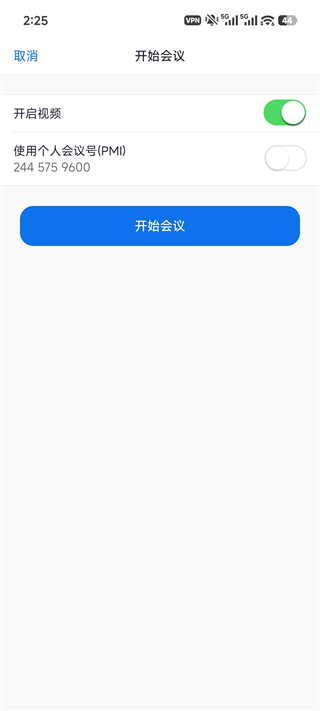 主界面可选择【开启视频】【使用个人会议号(PMI)】,点击蓝色按钮启动会议。