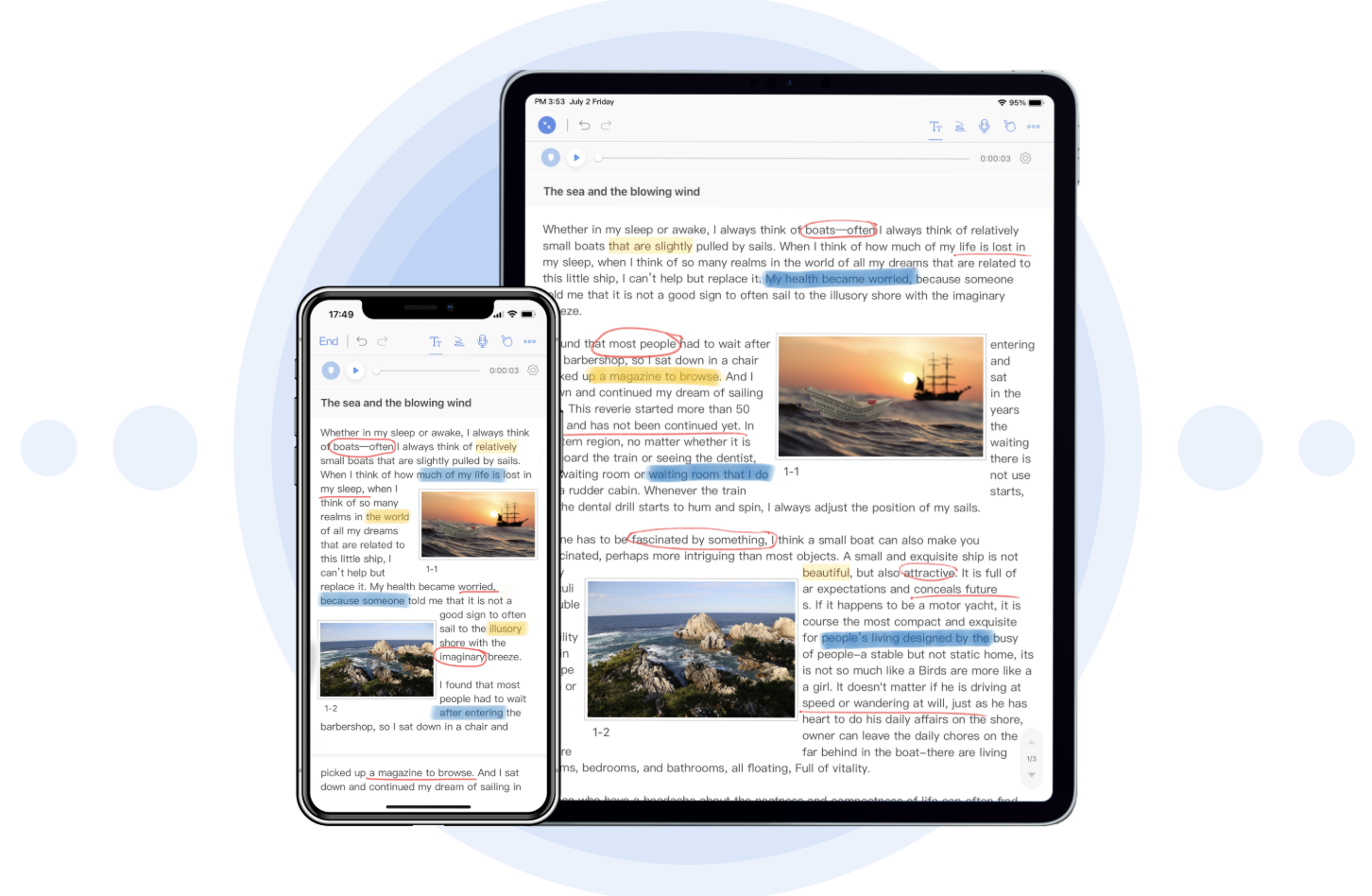 支持在文本上画笔涂鸦,便于快速标记,同时可以选择好看的纸张背景,给您提供发挥创意的无限空间。