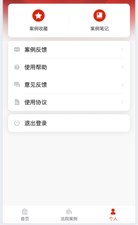 个人管理中可对收藏的案例、案例笔记、个人提交反馈进行管理,查看使用帮助和使用协议,以及退出登录。