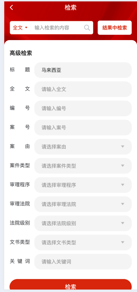 结果中检索:点击法院案例进入案例库后,除了首页提供的多种检索方式,还提供结果中检索,可以在上一次检索结果中继续做进一步的查询。