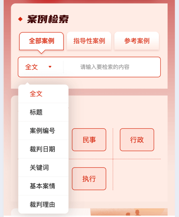 分库检索:切换指导性案例或是参考案例,可分别在指导性案例或是参考案例中进行检索。